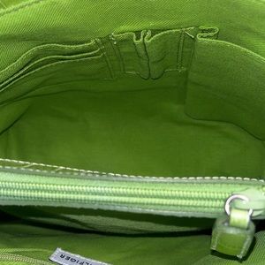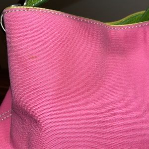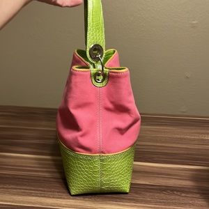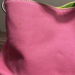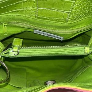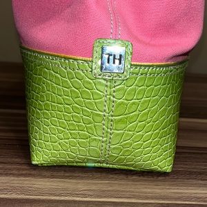 Adorable purse by Tommy Hilfiger the pink is canvas, and the yellow green section iss embossed faux leather crocodile texture. Inside has three compartments. The middle is a zipper pocket. Then one side has a small zipper pocket, and the other has a slip pocket and 2 spots for pens and a spot for 3 cards. In excellent used condition. Has one tiny little spot. Please see pictures.Smoke-free home. Offers welcome. Bundle and save. GREAT FOR SPRING!