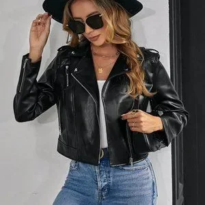 Black Preppy Womens Zip Up PU Leather Moto Jacket