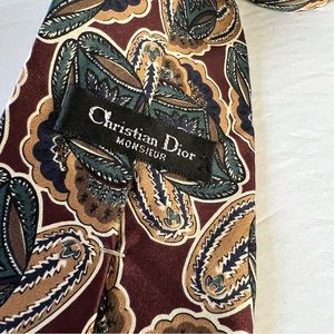 Christian Dior 100% Silk Neck Tie Read Description. Tie is in preowned condition with no tears and no visible stains though the underside of the tip obviously got dipped in some food of something and now does have some discoloration as pictured. See photos for approximate measurements.
