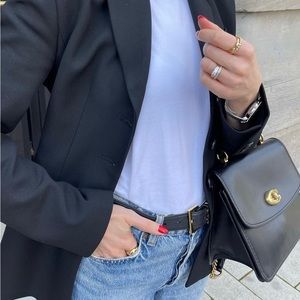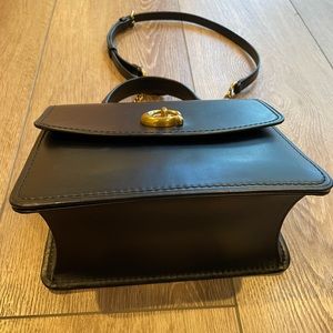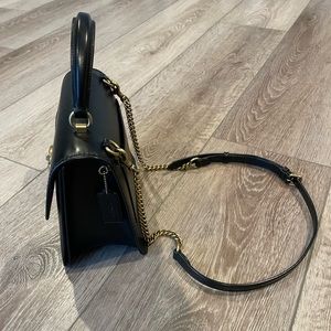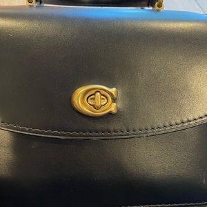 Gorgeous Black Coach Parker Top Handle Bag! Excellent condition. Very minor wear; please see photos for condition. Crafted in refined leather. Signature turnlock closure. Outer back slip pocket. Inner slip pockets and small zip pocket. Detachable, adjustable strap with gold hardware. Comes with leather coach tag. Very versatile piece in your wardrobe: carry it as a top handle, crook of your arm, or attach the strap and wear it as a shoulder bag or crossbody. Last 3 photos taken from Styledbysansha Instagram for styling inspiration.