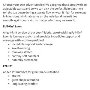 • 4 way stretch - moisture wicking - breathable full on luon material