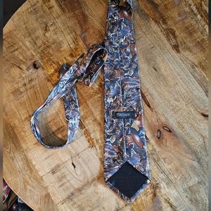 This unique rare silk tie showcases the art of Montagu Crafted in brown & navy blue silk with foxes, This rare piece can elevate any suit.