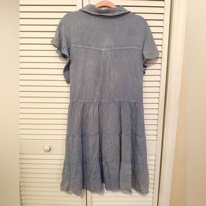 Washing solid dress with a collard neck, back pleated, ruffled shoulder, front pockets, and tiered skirt.