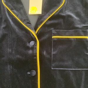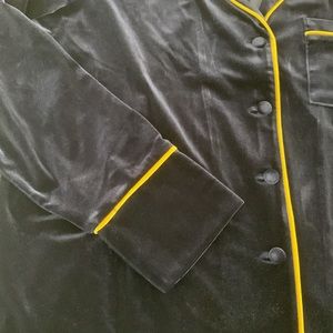 Contrast piping, matching velvet buttons and a sleek open, rounded collar.