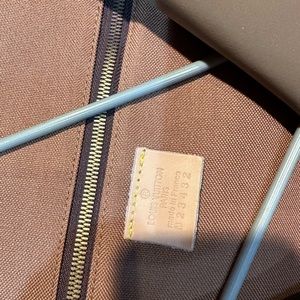 Brown monogram print with gold zipper.