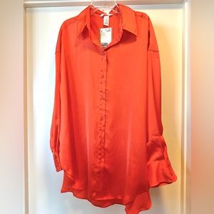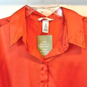 This H&M Satin Button Down Shirt Blouse is a beautiful Orange color, perfect for fall and super fun to wear! Brand new with tags. Very versatile. Wear long untucked like a tunic, with skinny jeans and high heels, or cinch it up and tie it at the waist for a flirty look. Oversized fit. Size Small