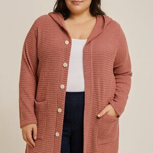This rose pink waffle knit hoodie cardigan has all the best features! Thumbhole cuffs, oversized side pockets and cute coconut buttons.