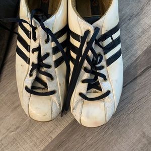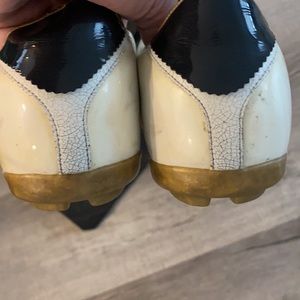 Adidas Y-3 vintage sneakers from around 2001/2002. Patent leather and cracked leather on front with navy stripes. They are an off white color. Size 8 woman's. Ran a bit big. Good used condition. Comes with Y-3 dust bag.