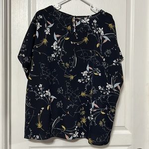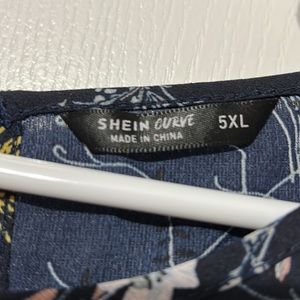 Navy Blue multi patterned SHEIN Blouse. The size is a 5XL but fits more like a 3X. The material is 100% Polyester. The pit to pit is approximately 25.5 inches. The length is approximately 26.5 inches.