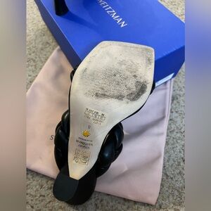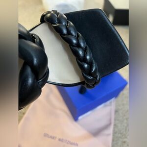 Only worn once! Comes with the box and bag! Cute slip on black sandals. Square toe, unique heel, and cute braided design across the foot. Super soft, super comfy and stylish pump!