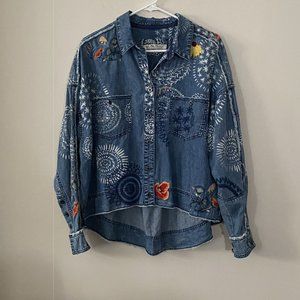 Totally timeless in a staple denim fabrication, this classic button-down top features exaggerated print detailing and embroidery throughout with raw seaming for a true lived-in look.