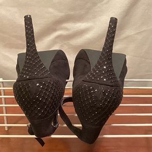 Rhinestone heels, stilettos Style& Company size 11 dress shoes. they have a half inch platform on the toes and a 6 inch high heel. with rhinestones on the back of the shoe and heels by glisten when you walk in It looks like suede material. very striking shoes no damage to heels or anywhere else. Sparkly, sexy, dressy. No missing rhinestones.