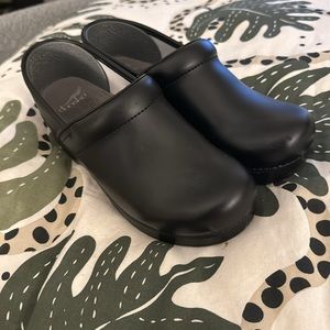 Dansko professional clogs in black leather. Some typical wear (see photos) but worn less than 15 times total. Size 39 EU/8.5 US women’s.