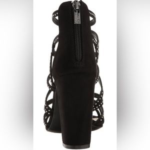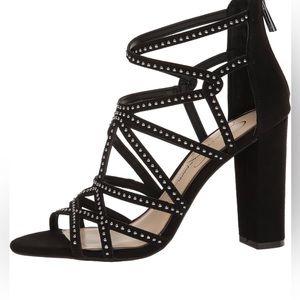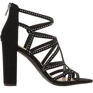 Jessica Simpson’s stylish Emmi block heeled sandals in black microsuede. Tiny silver dome studs dot the intertwined cage straps for a rocking, sexy look. Back zip closure and 4” heel. Very good used condition.