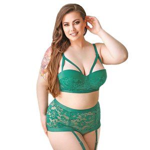 Strappy Bra and Gartered Panty Set Women 3x 4x Emerald Green High Waist Lingerie
