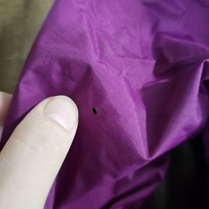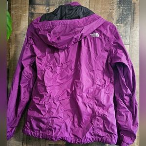 womens northface water resistant jacket. purple in color. size is medium. condition is perfect other than a small hole on the back of the left arm (shown in pictures)