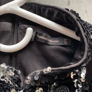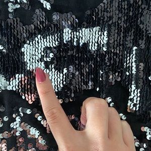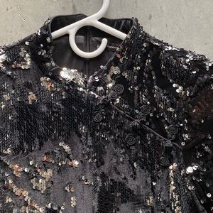 Multicolored black and silver sequin and velvet bodycon dress with 3/4 sleeves and mandarin collar. Used once for New Year’s Eve.