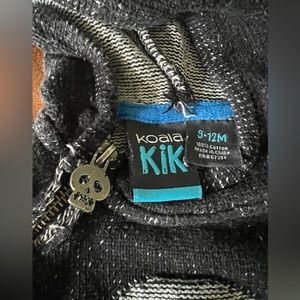 This cozy hooded sweater is 100% cotton and a size 9-12m. It features a zipper with a skull zip pull for ease of putting their little heads in. It is a heathered black. It is preloved so please use pic as description.