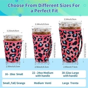 package includes 1 small (fits 16 - 18 oz), 1 medium (fits 22 - 24oz) with handle, and 1 large (fits 32 oz)with handle ice coffee sleeve.