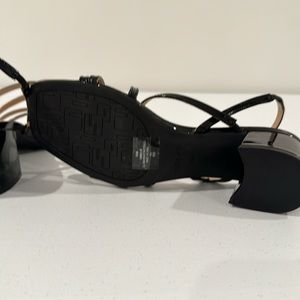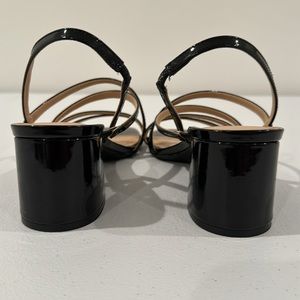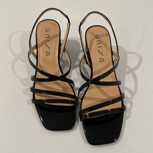 New never worn Unisa Black strappy sandal with a patent leather look. Easy slip on, padded foot bed with a 3.25” block heel. This is a beautiful shoe.
