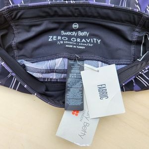 Super cute, brand new with tags, Sweaty Betty Zero Gravity 7/8 Length Running Leggings. Size XXS. Stretchy fabric with flattering seams ro sculpt the bum. Sweat-wicking and suitable for multiple sports. Zipped back and side pocket for essentials. Print is called "black abstract scene print" and is black / purple / white. Fabric is 59% polyamide / 41% elantane. Comes from a non-smoking home.