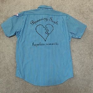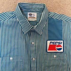The blue-and-white striped shirt was clearly part of a Pepsi uniform — either from a warehouse or delivery drivers — with the early 1990s Pepsi logo patch over the left chest. Another Pepsi patch on the left sleeve is triangular and says “The Customer is Why.”