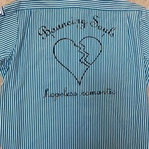The back has “Bouncing Souls” and “Hopeless Romantic” with a broken heart between them, all stenciled in black paint. Almost certainly a reference to the punk band The Bouncing Souls’ 1999 album/song “Hopeless Romantic”, this would definitely a conversation-starter!
