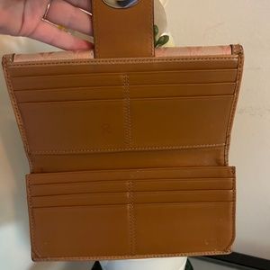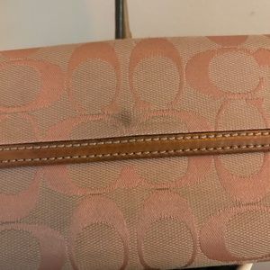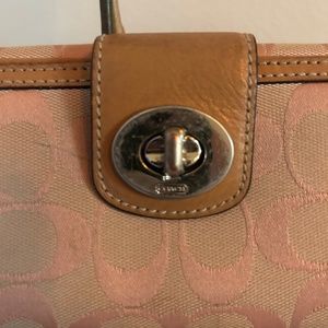 Authentic Coach Beige Signature Fabric Pink Patent Leather Turnlock Slim Wallet. Shows some signs of being pre-loved but is a gorgeous wallet in a unique dusty pink and tan color. Some scratches on the Turnlock as well as a small stain on the back of the wallet (both pictured.) Pricing has been adjusted accordingly. I ship next business day and am always open to offers!