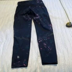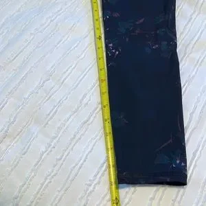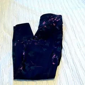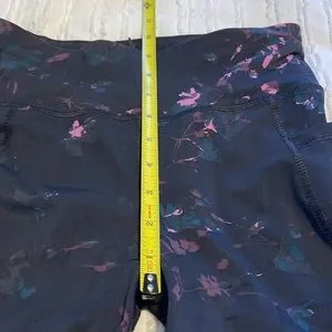 Zero gravity leggings provide medium compression with lightweight fabric. Great for running and sweaty workouts. Midrise. Reflective detail on back of legs and two side drop in pockets. Zipper pocket on back. Lack background with floral print. Smoke free pet friendly home. Worn a handful of times.