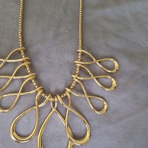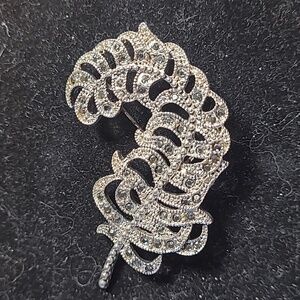 Un-marked vintage, gold toned dangling earrings. Approximately 1", curlique design with an AB black crystal in the center.