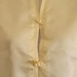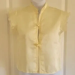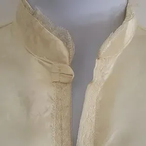 Vintage Stoplight Bed Jacket. Cream floral silky material. Lace around the cap sleeves and around the neck. The tag says size medium, but it is more like small. It is missing the knot button on the top. No rips, tears, snags, or stains. This is in good condition.