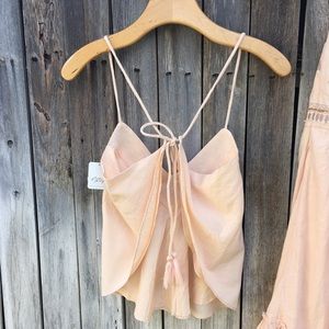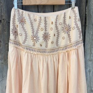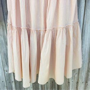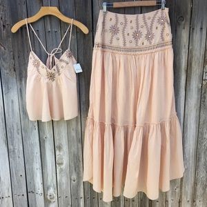 Super cute ultra boho chic mirrored floral embroidered bohemian vibes tie back tank and flowy tiered maxi skirt in soft peach neutral color cotton linen blend