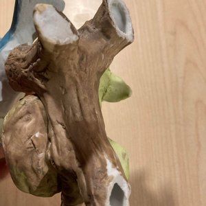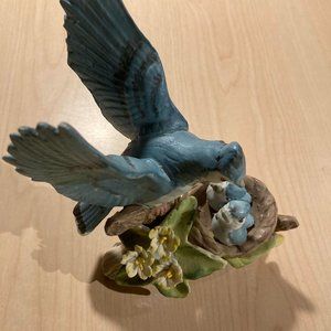 Beautiful Ceramic Mom Blue Jay/Bird w/Babies In Nest Tree/Leaves Yellow Primrose about 5 inches tal