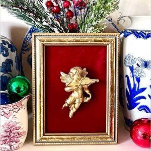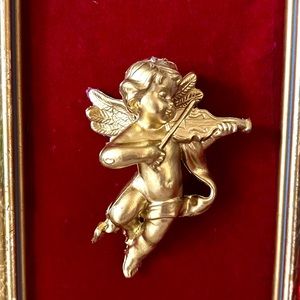 OH SO Sweet! Vintage Golden Cherub Playing a Violin with a Gold Ornate Frame. This beautiful Angel rests against Rich Red Velvet. French fabric backing. A Beautiful Gift or a Special Treat for Yourself!