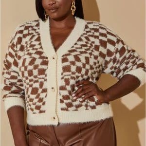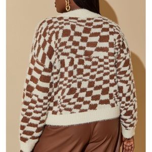 Our cardigan speaks to 90s preppy fashion, textural with brushed knit over a brown & cream check pattern before settling into a loose, cropped fit.