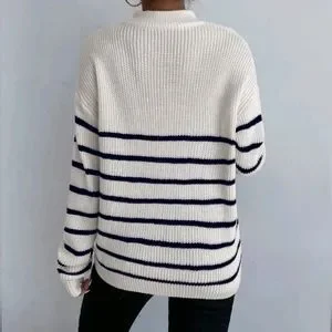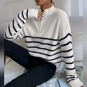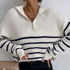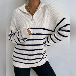 NEW Chic Zip Striped Oversized Knit Pullover Sweater Top White Black