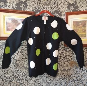 Quacker Factory black cardigan green and white polka dot sequins 100% cotton