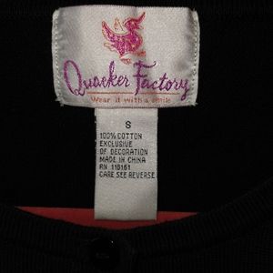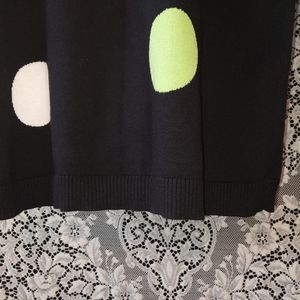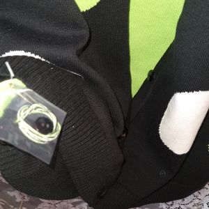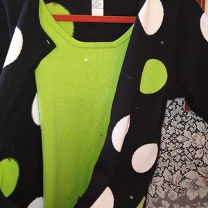 Quacker Factory size small black cardigan / sweater with large green and white polka dots / circles. This button up cardigan has sequins and a green faux under shirt that also has sequins. Made of 100% cotton material. This item has never been worn, has thread packet with extra button attached. No snags, stains, tears or signs of wear. Shipped from the US. No Tariffs. Sold in the United States.