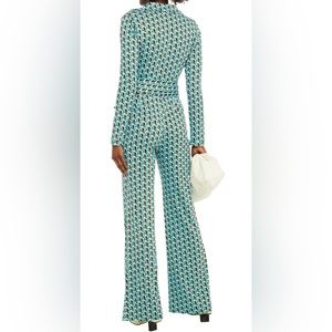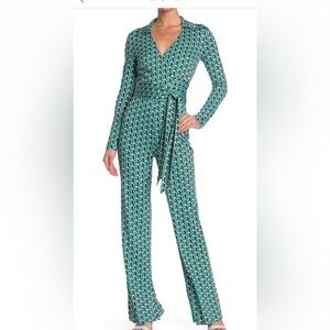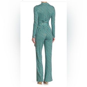 DIANE VON FURSTENBERG SHELBY PRINTED WAIST TIE SILK JUMPSUIT SIZE 12 brand new with tags designed to be fitted at the bust and waist with wide leg trousers-wrap effect printed silk -jersey jumpsuit