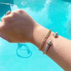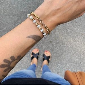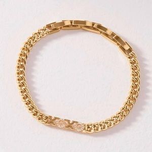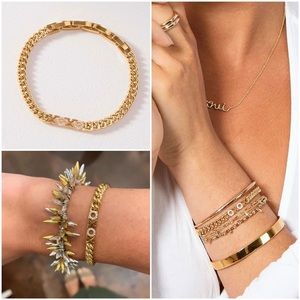 Handset pavé. Wear your love for all to see! Great as a stand alone or stacked with an arm party. Gold plated with a shiny finish. 7 ½" Length. Adjusts to fit SM-LG Wrists. Box Clasp Closure. Final sale. Please ask questions before purchasing.