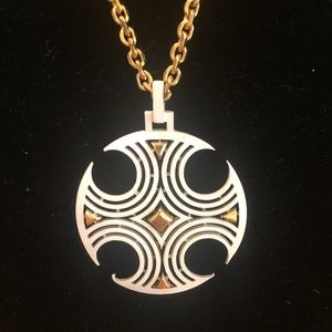 This is such a beautifully unique Trifari pendant necklace. It’s a gold chain with a white and gold circular pendant.