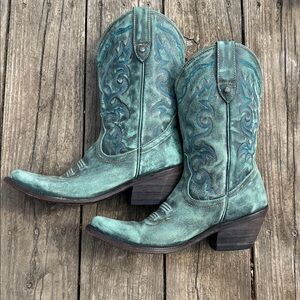 Super cool Corral leather boots. Distressed blue with brass/gold buckles. Pull on. No zipper. Women’s 9.5. Very nice condition only worn a few times.
