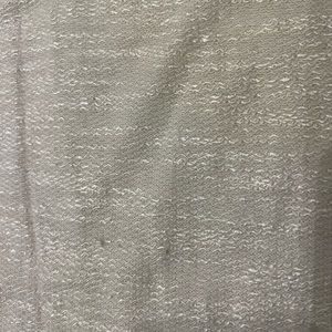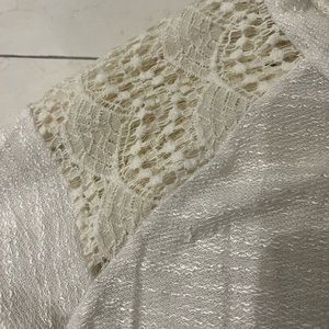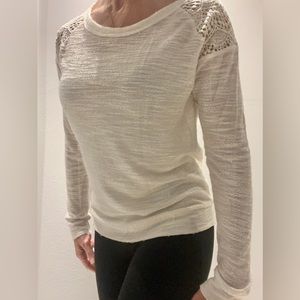 White sweatshirt style lightweight sweater with crochet lace detail at the shoulders.