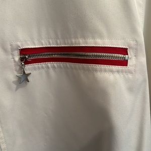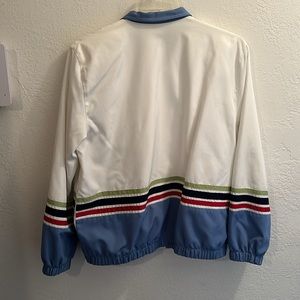 Vintage light jacket perfect for fall and spring weather, or for layering. 100% polyester with flattering shoulder pads. Features contrasting blue collar and green, black, red and blue stripes. Pockets on each side along with a zippered lapel pocket. Zipper pulls are silver stars. Name written in ink on the inside of the collar but not visible when worn.
