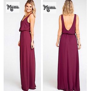 New with tag Show me Your Mumu Kendall maxi dress in merlot chiffon color. Soft v-neck and low back dress. Lined and elastic waist. No slits. Standard long bridesmaid length. Pit to pit 19.5, length from pit to bottom 56