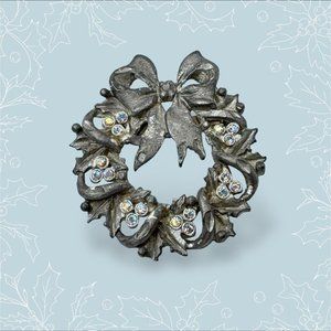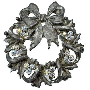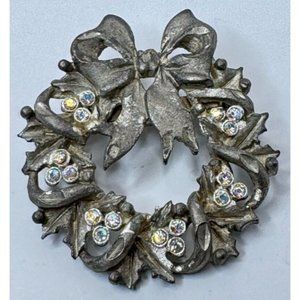 Christmas Wreath Brooch Pin Vintage Silvertone Small Rhinestones Bow Holidays
