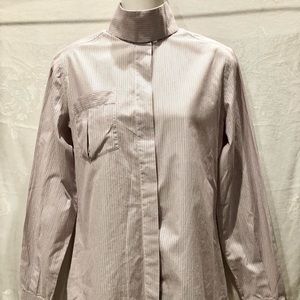 This is a lovely KITON Red, White & Blue Striped Shirt that was Custom Made for a nationally ranked equestrian. She’s a US size 4. It cost over $500. It is in good condition with light wear. 100% cotton shirting, mother of pearl buttons, removable snap on equestrian collar, inverted pleat pocket, gently shaping and buttoned cuffs. The only problem I see is that the buttons under the hidden front placket aren’t placed correctly and should be remarked and moved. You can’t see them anyway, but I would resew them on properly. Bust 38, Shoulders 15, Sleeves 24, Waist 34.5, Length 26.5.