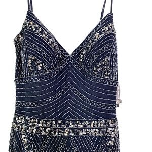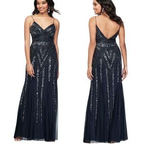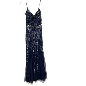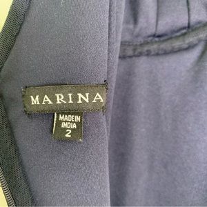 MARINA Deco Beaded Mesh A Line Gown with Godet Skirt Navy Size 2 NWT