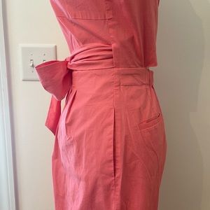 J. Crew Wrap-Tie Jumpsuit Bow Coral in size 4. In great used condition, with light fabric wear, one small pull, and faint small mark, all shown in pictures. Perfect for spring and Easter! Comes from a smoke-free, cat-friendly home. Measurements are included in pictures. Please inspect pictures closely and let me know if you have any questions!