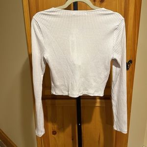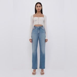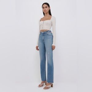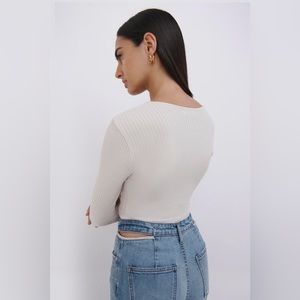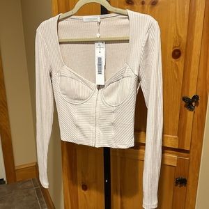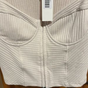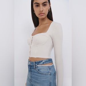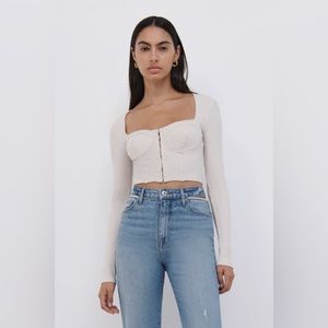 New with tags from a smoke free home. The Zoella Melange Bustier Top in Ceramic. Long sleeve knit top with open, squared neckline. Decorated with bustier-inspired knit ribbing and a hook-and-eye front closure bodice. Consciously crafted from a recycled knit blend.